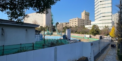 JR品川駅の西側、旧シナガワグース跡地「品川駅西口地区A地区新築計画」の現況です。地上29階、地下4階建ての事務所、商業、ホテル、カンファレンス、多目的ホールなどで構成される超高層ビルを計画しています。2023年より着工しており、敷地は既に仮囲いで覆われています。2026年度の竣工予定です。