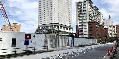みなとみらい線「馬車道」駅徒歩2分、JR京浜東北線「桜木町」駅徒歩9分の場所で建設中の「ブランズタワー横浜北仲」の現況です。東急不動産と京浜急行電鉄による地上40階地下1階建て、総戸数704戸、定期借地権の物件で、敷地内には水辺の広場、低層部には商業ゾーンが設けられます。2027年11月の竣工予定です。