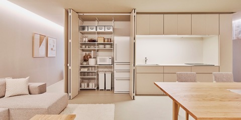 「無印良品のリノベーション」を手がけるMUJI HOUSEは新商品「MUJI INFILL FLAT」を販売開始しました。生活空間のノイズを極限まで抑えたデザインと、従来商品ではオプション仕様としていたZEH水準の断熱性能を標準仕様とした商品です。無印良品のユニットシェルフがぴったり収まる大きな開き戸収納や、継ぎ目のないリノリウムの床、建具枠・巾木のない壁など、美しく整った空間を8月1日にオープンした「無印良品のリノベーション 銀座店」で見学することができます。